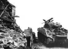 On 14 August, help came from the sky as the American airforce attacked German positions. The attack hit some of the French units by mistake. Thus, on the western side of town, at "Udon's" crossing, the French tank Bir Hakeim was destroyed along with its crew and four nearby civilians.[26]