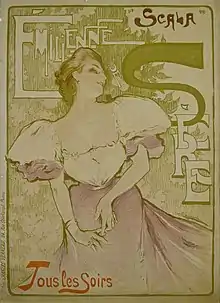 She performed at the Alcazar de Bruxelles[note 1][7] and at the Salone Margherita (Napoli) in Naples[8] in 1899,[9] at the Театр Омона in Moscow in 1900[10] at the Alcazar of Marseille in 1901[11][12] in Roma[13] in Naples[14] at the Kursaal[15] or "Nouveau-Théâtre" in Geneva[16][17] at the Palace Theatre, London in 1902, then in Düsseldorf, Berlin and Vienna[18] and at the Central-Theatre in Leipzig in 1903.[19]