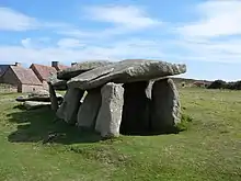 On the island is a prehistoric site, an allée couverte (gallery grave), known as Ty Liac'h, built in the Neolithic period. It is in the central part of the ridge of the island. There are ten upright stones, supporting three horizontal slabs. There are other stones on the ground which once were supporting stones; there was at least one other horizontal slab. The original length was 14–19 metres (46–62 ft), and it had a lateral entrance on the north side.[2]