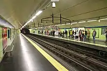 Ópera [ˈo.pe.ɾa] is a station on Line 2, Line 5 and Ramal of the Metro de Madrid. It is located in fare Zone A, in the Plaza de Isabel II, in the central district of Madrid.[1][2][3] The station provides access to an area with tourist landmarks such as the Teatro Real opera house, the Plaza de Oriente and the Royal Palace. Its name comes from nearby Madrid opera house, the Teatro Real.