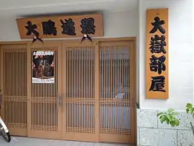 The entrance to the stable. The horizontal sign reads "Taihō-dōjō". The vertical sign reads "Ōtake-beya".
