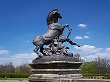 The Baroque Garden à la française and landscape park, with significant statues by 19th-century artist Emmanuel Frémiet and fountains that survived, is within the former Palace's extensive forested landscape grounds. Two pairs of lion statues survived, now decorating parks in Zabrze and Gliwice, as well as a wrought iron gate currently at the Silesian Zoological Garden in the Katowice and Chorzów districts of Silesia.