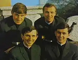 By 1968 the band acquired all the necessary equipment—with their first electric guitar being a gift from Cardinal Franjo Šeper[1][2]—performing in the following lineup: Mijo Bergovec (vocals, guitar, organ), Mato Dukić (vocals, bass guitar), Valent Bogadi (guitar) and Mijo Gabrić (drums).[1] This lineup had their first public performance on 3 February 1969, in the Iskra Hall in Zagreb.[1] The band performed beat music with religious lyrics, so the Yugoslav press nicknamed them "električari u haljama" ("electric musicians in robes").[1] Their repertoire also included compositions by French singer-songwriter and Jesuit Aimé Duval, in their own arrangements and with Serbo-Croatian lyrics, and other spiritual songs.[1]