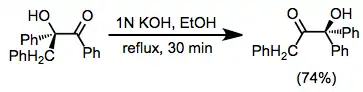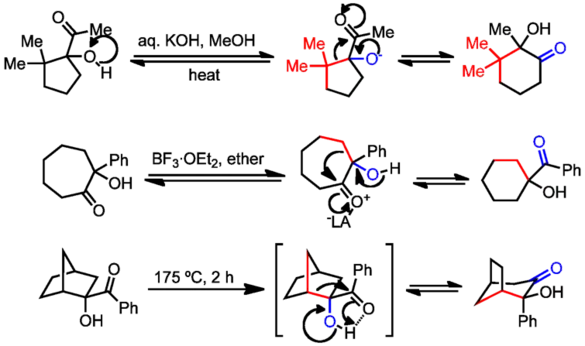 Under basic conditions, the reaction is initiated by deprotonation of the hydroxyl group.[7] Substrates must lack α-hydrogens to prevent competitive reactions involving enolates. Under Brønsted- or Lewis-acidic conditions, coordination to the carbonyl oxygen occurs first, and under thermal conditions, intramolecular proton transfer takes place at the same time as migration. The reversibility of the reaction implies that reaction products are more thermodynamically stable than the corresponding starting materials. Starting materials incorporating ring strain, for instance, will rearrange to products lacking strain.
