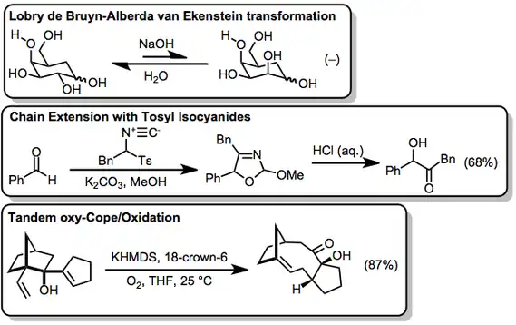 Synthesis of α-hydroxy carbonyl compounds is most commonly accomplished by either chain extension or oxidation of carbonyl compounds. In conjunction with aldehydes and ketones, tosyl isocyanides can be used to form α-hydroxy ketones after hydrolysis of the resulting oxazolines. The sp-hybridized isocyanide carbon becomes the carbonyl carbon of the product.[19] A variety of reagents exist to oxidize enolates to α-hydroxy carbonyl compounds—in the example here, oxy-Cope rearrangement generates an enolate, which is then oxidized in the presence of molecular oxygen.[20]