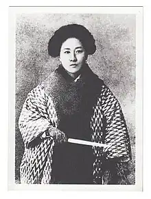 In 1903, she decided to travel overseas and study in Tokyo, Japan,[9] leaving her two children behind. She initially entered a Japanese language school in Surugadai, but later transferred to the Girls' Practical School in Kōjimachi, run by Shimoda Utako (later to become Jissen Women's University).[10] The school prepared Qiu Jin with the skills she needed for revolutionary activities later on. With the education from Shimoda school, many female activists participated in the Republican Revolution in 1911. During her time in Tokyo, Qiu also helped to establish the Encompassing Love Society, a women’s group that promoted women’s education and protested the Russian presence in northeast China.[5] She was very fond of martial arts, and she was known by her acquaintances for wearing Western male dress[11][12][1] and for her nationalist, anti-Manchu ideology.[13] She joined the anti-Qing society Guangfuhui, led by Cai Yuanpei, which in 1905 joined together with a variety of overseas Chinese revolutionary groups to form the Tongmenghui, led by Sun Yat-sen. Already known as a calligrapher and a poet, Qiu described herself as “tossing aside the brush to join the military ranks,” in encouraging educated women not to waste time on poetry but to instead engage in direct action.[5]