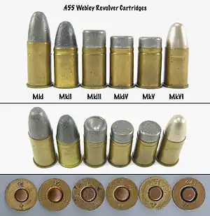 • .455 Webley Mk V [11.55×19.3mmR]: Introduced in 1914. Identical to the Mk IV bullet,[4][5] but cast from a harder lead-alloy containing more antimony with cordite propellant. This cartridge was only in use from April to November 1914. Upon its withdrawal the Mark II cartridge was returned to service. Remaining stocks were designated for target practice and unloaded cases were loaded with Mark II bullets.