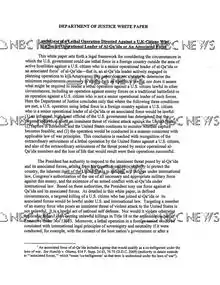 This white paper sets forth a legal framework for considering the circumstances in which the U.S. government could use lethal force in a foreign country outside the area of active hostilities against a U.S. citizen who is a senior operational leader of al-Qa'ida or an associated force[1] of al-Qa'ida—that is, an al-Qa'ida leader actively engaged in planning operations to kill Americans. The paper does not attempt to determine the minimum requirements necessary to render such an operation lawful; nor does it assess what might be required to render a lethal operation against a U.S. citizen lawful in other circumstances, including an operation against enemy forces on a traditional battlefield or an operation against a U.S. citizen who is not a senior operational leader of such forces. Here the Department of Justice concludes only that where the following three conditions are met, a U.S. operation using lethal force in a foreign country against a U.S. citizen who is a senior operational leader of al-Qa'ida or an associated force would be lawful: (1) an informed; high-level official of the U.S. government has determined that the targeted individual poses an imminent threat of violent attack against the United States; (2) capture is infeasible, and the United States continues to monitor whether capture becomes feasible; and (3) the operation would be conducted in a manner consistent with applicable law of war principles. This conclusion is reached with recognition of the extraordinary seriousness of a lethal operation by the United States against a U.S. citizen, and also of the extraordinary seriousness of the threat posed by senior operational al-Qa'ida members and the loss of life that would result were their operations successful.