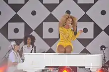 On July 1, 2011, Beyoncé performed a free concert as part of Good Morning America's Summer Concert Series. She sang "1+1" while kneeling on top of a white grand piano.[74] Beyoncé also performed the song live on the TV show, The View.[75] She sang "1+1" live on August 14, 2011, during 4 Intimate Nights with Beyoncé, held in Roseland Ballroom, New York City.[76] Wearing a gold dress, she performed the song in front of 3,500 people while her band and orchestra were watching on.[76][77] During the performance, Beyoncé climbed on top of a piano and sang on her knees.[78] Erika Ramirez of Billboard magazine wrote that Beyoncé performed "1+1", "wrapped up in smoke and red hued lights, reminiscent of her live performance on the American Idol finale."[79] Ramirez stated that Beyoncé sang the ballad with "impeccability."[79] Mike Wass of Idolator praised how Beyoncé "wrung every ounce of emotion from the lyrics of '1+1' and hit each note perfectly", concluding that it was "an impressive display."[80] Entertainment Weekly's Brad Wete wrote that Beyoncé's voice "rang soulfully, only breaking to let the crowd fill in gaps for a sing-along feel."[76] Joycelyn Vena of MTV News commented that on "1+1", Beyoncé's vocal abilities "outshined it all."[81] On September 14, 2011, Beyoncé stopped at Target perform at the managers meeting. Wearing a red dress, she sang "1+1" accompanied by three backup singers and a pianist.[82] During the ITV special A Night With Beyoncé which aired on December 4 in the United Kingdom, Beyoncé performed "1+1" to a selected crowd of fans.[83]