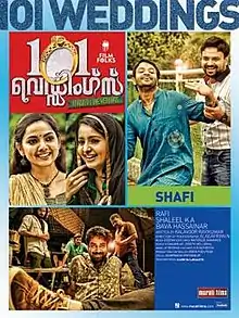 101 Weddings is a 2012 Indian Malayalam-language romantic comedy film directed by Shafi and starring Kunchacko Boban, Jayasurya, Biju Menon, Samvrutha Sunil, and Bhama in the lead roles. The film is written by Kalavoor Ravikumar based on a story by the director. The film is produced by Shafi's brother Rafi Mecartin, Hasainar, and Shaleer, with audiography by M. R. Rajakrishnan under the banner of Film Folks and features music composed by Deepak Dev.[2]