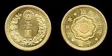 Ten yen coins were first issued in 1871 from a newly established mint at Osaka.[2] The origin of mintage is not clear as there are conflicting reports stating that ten yen coins were either minted in San Francisco, or in Japan the prior year.[3][4] In either case the unit of yen was officially adopted by the Meiji government in an act signed on June 27, 1871.[5] Under the new law each ten yen coin was to weigh 257.2 grains, and contain 90% gold with a foreign exchange rate close to a United States Eagle (US$10 coin).[6] Gold bullion for coinage was delivered from private Japanese citizens, foreigners, and the Japanese government.[7] No ten yen coins were minted between 1871 and 1876, during this time the Japanese government tried unsuccessfully to implement a gold standard with the amount of gold in circulation described as "very trifling". Gold bullion rose to a slight premium in 1874 which caused gold coin production as a whole to rapidly fall off. It was reported in the Quarterly Journal of Economics that by 1876 more gold coins were exported to foreign countries than for use domestically.[8] Japan was later forced off of the gold standard in 1877 due to the cost of the Satsuma Rebellion.[9] Twenty years would pass before the Japanese government went back on the gold standard. During this lapse non circulating ten yen gold coins were made in two non-consecutive years for two different reasons. The first occasion occurred in 1880 when ten yen gold proof coins were struck for exclusive use in presentation sets that were given away as gifts to foreign diplomats.[10][11] The second and final instance involved the World's Columbian Exposition in 1892 where several newly minted coins were put on display.[12]