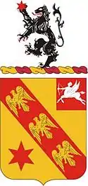 The 11th Field Artillery was formed by the transfer of personnel from the 6th Field Artillery and served in France in the 6th Division, its battle service being in the province of Lorraine. The arms of Lorraine have three alerions on the red band, the field being gold. To this is added the insignia of the 6th Division and, on a canton, the crest of the 6th Field Artillery. The crest is a black lion rampant taken from the arms of Stenay in commemoration of the principal action of the Regiment, which was in support of the 89th Division during the crossing of the Meuse near Stenay. The insignia of the 6th Division is in the lion's paw.[4]