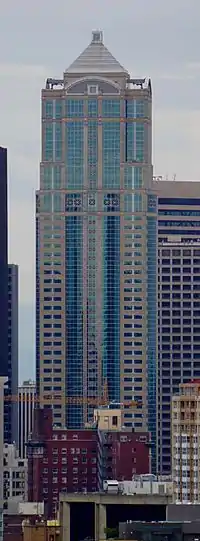 1201 Third Avenue (formerly Washington Mutual Tower) is a 235.31-meter (772.0 ft), 55-story skyscraper in Downtown Seattle, in the U.S. state of Washington. It is the third-tallest building in the city, the eighth-tallest on the West Coast of the United States, and the 97th-tallest in the United States. Developed by Wright Runstad & Company, construction began in 1986 and finished in 1988. 1201 Third Avenue was designed by Kohn Pedersen Fox Associates and The McKinley Architects. The building was the world headquarters of the financial company Washington Mutual from the building's opening until 2006, when the company moved across the street to the WaMu Center (renamed the Russell Investments Center after the bank collapsed in 2008).