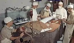 An airborne field ambulance was commanded by a lieutenant-colonel, with a major as the second in command and a regimental sergeant major as the senior non-commissioned rank. Headquarters staff included two specialist surgeons and a specialist anaesthetist, a pharmacist and an Army Dental Corps dentist.[8] To assist in the operating theatre and with post operative care, there were six operating room assistants, a sergeant nursing orderly and six nursing orderlies.[8] Other medical staff were a sergeant sanitary assistant, a masseur, a dental orderly and five stretcher bearers, one of whom was trained as a shoemaker.[8] The rest of the headquarters consisted of a Quartermaster, clerks, cooks, storemen, an Army Physical Training Corps instructor, a barber and a joiner from the Royal Engineers.[8]