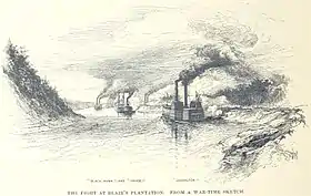 The 12th Texas fought at the Battle of Blair's Landing on 12 April 1864 during the Red River Campaign.[1] After the Union defeat at the Battle of Mansfield on 8 April, the Union fleet reversed course and began to move downstream. Thomas Green took his cavalry division to Blair's Landing to intercept the Federal gunboats and transports as they descended the river. The Confederate forces claimed to have inflicted heavy losses on Union soldiers in the transports as they passed, but Green was killed by a shot from one of the gunboats.[16] Thomas Oliver Selfridge Jr., the commanding officer of the monitor USS Osage reported that the Confederates lined the high banks of the river and fired their rifles at the vessels as they passed within 100 yd (91 m). The Osage fired canister shot in reply, and when that was exhausted, the gun crews fired shrapnel shell with the fuses cut to one second. The battle lasted one hour and a half. Selfridge reported that everything aboard made of wood was riddled by bullets, and the armor plate of his ship's pilot house had 60 bullet marks in it, but his crew only lost seven wounded.[17] The Confederates reported negligible losses, except for Green, and about 50 Union soldiers on the transports became casualties.[18]
