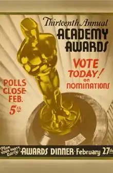 The 13th Academy Awards were held on February 27, 1941, to honor films released in 1940. This was the first year that sealed envelopes were used to keep the names of the winners secret.[1] The accounting firm of Price Waterhouse was hired to count the ballots, after voting results in 1939 were leaked by the Los Angeles Times.