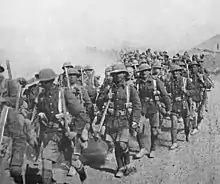 The 13th (Western) Division landed at Anzac Cove on the Gallipoli peninsula in July 1915 in preparation for the Battle of Sari Bair (The August Offensive) beginning on 6 August.[3] Although all of its component infantry battalions arrived, the divisional artillery did not arrive for some months.[4] Initially in reserve to the main break-out from Anzac by units of the New Zealand and Australian Division, the 38th and 39th Brigades were sent in as reinforcements as the attack stalled.[5]