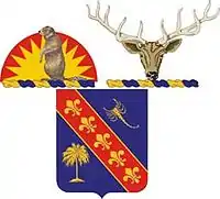 - Shield: The shield is blue to recognize the organization's 1898 Infantry heritage. The palm tree symbolizes the service as Infantry in the Philippines and the scorpion the service as Infantry on the Mexican border. The five fleurs-de-lis on the red bend represent the five engagements as Field Artillery in France during World War I.