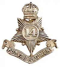 The 14th Punjab Regiment was a regiment of the British Indian Army from 1922 to 1947. It was transferred to the Pakistan Army on independence in 1947, and amalgamated with the 1st, 15th and 16th Punjab Regiments in 1956, to form the Punjab Regiment.[1]