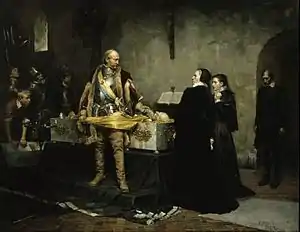 The regent duke Charles (later king Charles IX) insulting the corpse of Clas Eriksson Fleming in presence of the Dowager-Governor of Åbo, Ebba Stenbock. Albert Edelfelt’s painting, 1878.