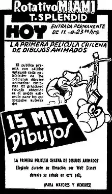 15 mil dibujos ("15 Thousand Drawings") is a 1942 Chilean animated film of 35 millimeters made by the filmmakers Juan Carlos Trupp and Jaime Escudero Sanhueza. It was filmed by Enrique Soto, and its music was performed by Chilean band Los Huasos Quincheros. 15 mil dibujos is the third animated film made in Chile, after Transmisión del mando presidencial (1921) and Vida y milagros de Don Fausto (1924).[1][2]
