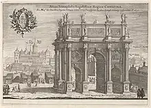 Painting of the Tre kronor castle by Govert Camphuysen from 1661. The building Lejonkulan can be seen on this picture to the right outside the wall. However, the building has been proven to be much large than what this painting illustrates.[1]