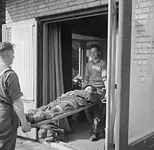 The war establishment of a Parachute Field Ambulance, was 177 all ranks.[4] Consisting of thirteen doctors in two surgical teams and four sections.[4] The doctors could deal with 330 cases in a twenty-four-hour period. Each surgical team could handle 1.8 operations an hour.[5] But that was not sustainable, and if they were required to operate the following day, the team had to be relieved after twelve hours.[5] It was envisaged that during airborne operations, it would not be possible to evacuate casualties until the ground forces had linked up with them.[6] Therefore, the field ambulance had the ability to treat all types of wounds, and provide post-operative care for up to fourteen days.[nb 1] They also had the transport required to evacuate casualties from the Regimental Aid Post (RAP), to the Main Dressing Station (MDS).[7]