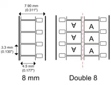 The split screen in 17 Reasons Why was produced through Double 8, a technique common within experimental cinema during the 1970s.[3] Double 8 mm film uses a single film strip that is 16 mm wide. Only half the width is exposed at any given time, and the camera operator flips the roll once one side is complete. When the roll is developed, the strip is slit along the center to separate it into two 8 mm strips. To create the quadrisected image, Dorsky created a 16 mm strip from printing the unslit 8 mm strips, such that each 16 mm frame contains four smaller 8 mm frames.[4][5]