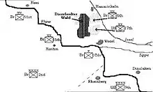 However, as planning for Operation Varsity began, it soon became obvious that there was a lack of suitable transport aircraft to transport all three airborne divisions.[38] As such the 13th Airborne Division was dropped from the operational plan, primarily because it had no combat experience, whereas the 6th Airborne Division had participated in Operation Tonga, the British airborne landings during Operation Neptune, and the 17th had seen combat in the Ardennes.[38] The plan for the operation was therefore altered to accommodate the two remaining airborne divisions. This would be the first airborne operation the 17th would take part in, and indeed would be its only before it was disbanded. The two airborne divisions would be dropped behind German lines, with their objective to land around Wesel and disrupt enemy defences in order to aid the advance of the British Second Army. To achieve this, both divisions would be dropped near the town of Hamminkeln, and were tasked with a number of objectives; they were to seize the Diersfordter Wald, a forest that overlooked the Rhine and had a road linking several towns together; several bridges over a smaller waterway, the Issel, were to be seized to facilitate the advance; and the town of Hamminkeln was to be captured.[39] Once these objectives were taken, the airborne troops would consolidate their positions and await the arrival of Allied ground forces, defending the territory captured against the German forces known to be in the area.