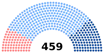 Note that these groupings are not formal party affiliations. Instead, they reflect groupings made by later historians based on the political opinions of the deputies. Historians do not always agree on how to draw these lines: Thomas Beck gives a similar number for the pro-government representatives (273), but assigns far more of the opposition to the left (170), leaving only seven legitimists.[3]