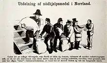 Caricature from the paper Fäderneslandet 14 December 1867, criticizing the unjust distribution of the relief help committees: the relief help are given first to county governor, and are thereafter given first to the wealthy officials and rich farmers and last, when only an handful is left, to the poor people truly in need.