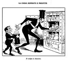 Cartoon in the satirical magazine L'Asino (The Donkey) in June 1893, with Giolitti (right) and Tanlongo (left). "Savings and loans: the coup succeeded." (L'Asino, June 11, 1893)