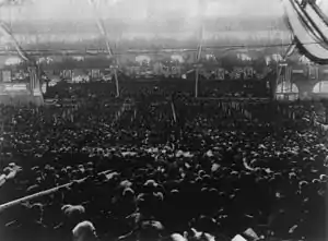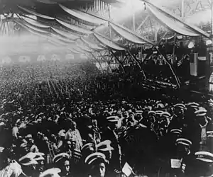 Several state delegations, mostly from the Northeast, supported the gold standard and refused to take part in the nomination process.[7] Many conservative Democrats looked to former Senator David B. Hill of New York or Governor William Russell of Massachusetts for leadership, but Russell was in poor health and Hill did not gain support for a presidential bid.[8] Eight names were placed in nomination: Richard P. Bland, William J. Bryan, Claude Matthews, Horace Boies, Joseph Blackburn, John R. McLean, Robert E. Pattison, and Sylvester Pennoyer. The only major candidate that did support the gold standard was former Pennsylvania Governor Pattison.[7] After five ballots, Bryan triumphed over Bland and Pattison.[7] Bryan was also nominated for president by the Populist Party and the Silver Republican Party.