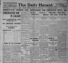 At the same time, Conservative leader Bennett promised crowds in Calgary that if elected, his conservative government would establish the capital in Calgary.[45] His Liberal opponent and Minister of Public Works William Henry Cushing also pledged to bring the capital to Calgary, earning him the endorsement of the Calgary Albertan published by William McCartney Davidson.[45] However, the Calgary Herald opposed Cushing and accused that the federal liberals were intent on "the destruction of that commercial and industrial supremacy" of Calgary, while also claiming that the provincial Liberals were controlled by the federal party.[46][47]