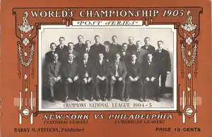 The 1905 World Series was the championship series in Major League Baseball for the 1905 season. The National League (NL) champion New York Giants defeated the American League (AL) champion Philadelphia Athletics, with the Giants winning 4 games to 1, now in a best-4-of-7 format. Four of the five games featured duels between future Hall of Fame pitchers. The games were the second edition of the World Series after the initial meeting in 1903, since the 1904 season ended with no Series held.