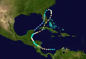 As the system continued to move west on October 9, it strengthened into a hurricane, and while it began to curve toward the west-northwest, further strengthening occurred, as it intensified into a Category 2 hurricane. The hurricane made landfall in Nicaragua on October 10 as a Category 3 hurricane. The system quickly weakened to a tropical storm as it traveled west-northwestward on October 11, later passing over the Gulf of Honduras. It later struck Belize on October 13 as a strong Category 1 hurricane on October 13, tracking north-northwestward.[10]