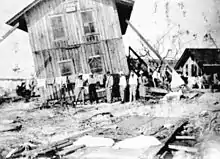 In Key West, sustained winds reached 84 mph (135 km/h). The streets became a "mass of wreckage", with about half of the city described as virtually destroyed.[8] Along Duval Street, telephone and light poles were downed due to high winds. Throughout the city, many frame buildings suffered some degree of damage.[9] At least 500 homes were destroyed, as were seven churches and nine cigar factories, which were among the largest in the Southern United States. The storm demolished two engine houses at the fire department, causing the deaths of several horses and nearly killing firemen in the collapse.[8] Additionally, the post office was damaged and the First National Bank was deroofed. In the vicinity of the island, hundreds of ships were wrecked.[9] Overall, damage in Key West reached approximately $2 million.[9][10] Newspapers initially noted a death toll around 800, with some reporting as many as 3,000 fatalities. However, this was later found to be greatly exaggerated.[11] Two deaths occurred, both from fatal injuries during the storm.[10] After the storm, Key West mayor Joseph N. Fogarty declared martial law, while guards were ordered to patrol the streets. The United States government was asked to send armed forces for additional policing.[12]