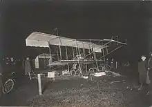 Grahame-White attempted to make a test flight earlier that day, but the huge crowds hampered his efforts, and he was unable to take off. Having spent two days supervising the reconstruction of his aeroplane, he retired to a nearby hotel. At about 6:10 pm he was awakened with the news that Paulhan had begun his attempt, and he decided to set off in pursuit. This time he had no trouble clearing a space in the crowd.[15] His biplane's engine was started, and by 6:29 pm he passed the starting line. Almost an hour later he flew over Leighton Buzzard, just as Paulhan was passing over Rugby. As night approached, Grahame-White landed his aeroplane in a field near the railway line at Roade, in Northamptonshire.[16][17] Fifteen minutes later, Paulhan reached Lichfield, where about 117 miles (188 km) into his journey he ran out of fuel. He managed to land the biplane in a field near Trent Valley railway station.[12][18] The aeroplane was pegged down, and Paulhan left with his colleagues to stay overnight at a nearby hotel. Grahame-White meanwhile stayed at the house of a Dr. Ryan. Both aviators intended to restart at 3:00 am the following day.[17]