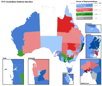 The 1919 federal election was the first to use preferential voting.[6] The Commonwealth Electoral Act 1918 replaced the previous first-past-the-post system used in the House of Representatives, and also re-introduced postal voting. It was amended the following year to also allow preferential voting for the Senate.[7] The new act repealed the existing Commonwealth Franchise Act 1902, but did not alter the terms of the Commonwealth Electoral (War-time) Act 1917, under which naturalised British subjects born in enemy countries were disqualified from voting. This provision mainly affected German-Australians.[8] There was a long history of support for preferential voting in Australia, but the immediate trigger for the new legislation was the decision of farmers' organisations to run candidates of their own in opposition to the Nationalist Party. The Swan by-election in October 1918 saw an ALP candidate elected with just over one-third of the vote, after the Nationalist candidate split the vote with a candidate from the Country Party of Western Australia.[9] The Corangamite by-election in December was the first held under the new system, and resulted in the Victorian Farmers' Union candidate winning from Nationalist preferences.[10]