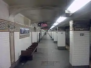 The 191st Street station has two tracks and two side platforms,[132] and is served by the 1 train at all times.[133] The station is between Dyckman Street to the north and 181st Street to the south.[134] Above the platforms is a mezzanine and covered pedestrian footbridges connecting the two platforms; people on the footbridges cannot see the tracks and platforms (and vice versa).[135][136] The mezzanine and footbridges are finished in glazed white tile and ceramic sheet marble. The station ceiling is supported by 34 steel columns encased in concrete.[12]