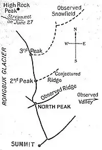 - ↑ A footnote to Bullock's diary says it was called "Mary" by Mallory and Bullock but this was later disallowed and that W. H. Murray called it "Ri-Ring".[31] However, Davis says Mallory wanted to call it "Mount Kellas" and states its "true elevation" as 22,520 feet (6,860 m) – the second highest mountain climbed at that time.[32] The 1988 National Geographic map marks an unnamed peak at 28°05′24″N 86°48′55″E / 28.0901°N 86.8154°E, 6,975 metres (22,884 ft) and this has the same location and topographical setting as the "Ri Ring" marked on Morshead's 1921 expedition map.[33] About 2.5 km NE of here the National Geographic map (and Google Maps) marks "Shuguang Peak" at 28°06′32″N 86°49′48″E / 28.1090°N 86.8300°E, 6,622 metres (21,726 ft) and other lists give "Hongxing Ri" at this location while saying it is also called "Ri Ring".