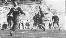 Notre Dame garnered interest from the Rose Bowl committee to play a PCC opponent for the 1925 football season.[4] Rockne and the Notre Dame administration realized how lucrative an annual trip to Los Angeles would be for the football program.[4] Notre Dame's west coast alumni began lobbying Rockne to bring the team to the Rose Bowl as a season finale on a yearly basis.[4] The Rose Bowl committee favored this arrangement; at the time there was no tie in with the Big Ten Conference. However, the PCC had reservations.[4] Specifically, two members schools, Stanford University and the University of California refused to play Notre Dame "on account of Notre Dame's low scholastic standards.[4] Since Notre Dame was a Catholic school, its academics were considered inferior at the time.[4] USC's coach, Gus Henderson reached out to Rockne through correspondence stating that "USC would welcome the chance to play Notre Dame New Year's Day in Pasadena.[4] While Rockne favored playing USC, Stanford, which won the PCC title, had first choice and eventually realized that playing Notre Dame would be lucrative, and the two played in the 1925 Rose Bowl.[4]