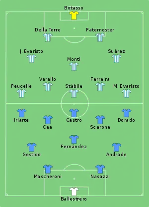 The stadium gates were opened at eight in the morning, six hours before kick-off, and at noon the ground was full,[2] officially holding 93,000 people.[3] Uruguay successfully "defended" its Olympic gold medal achievement 4–2, coming back from a 2–1 deficit at half-time.