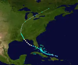 A tropical disturbance was first noted southeast of Puerto Rico on August 24. Moving to the northwest at 10 mph (15 km/h), the area of disturbed weather eventually crossed the island.[1] The Atlantic HURDAT database first lists the system as a tropical depression at 1800 UTC on August 26 while located north of Haiti, with maximum sustained winds of 35 mph (55 km/h). Steadily intensifying, the depression intensified to tropical storm strength at 1800 UTC on August 27.[2] The strengthening tropical storm passed to the south of Andros Island during the evening of August 29,[3] before making its first landfall 35 mi (55 km) south of Miami, Florida on Key Largo at 0400 UTC the next day as a strong, compact tropical storm with winds of 65 mph (100 km/h).[1][3] A weather station located at the Fowey Rocks Light recorded a peak wind gust of 89 mph (143 km/h). In the Atlantic hurricane reanalysis project, it was evidenced that the storm may have been a hurricane upon landfall on Florida.[3] After slightly weakening over land,[2] the tropical storm entered the Gulf of Mexico in the early morning hours of August 30, while located 30 mi (48 km) south of Fort Myers.[1]