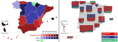 34,000 members of the Civil Guards and 17,000 Assault Guards enforced security on election day, many freed from their regular posts by the carabineros.[20] The balloting on the 16th of February ended with a draw between the left and right, with the center effectively obliterated. In six provinces left-wing groups apparently interfered with registrations or ballots, augmenting leftist results or invalidating rightist pluralities or majorities.[29] In Galicia, in north-west Spain, and orchestrated by the incumbent government; there also, in A Coruña, by the political left. The voting in Granada was forcibly (and unfairly) dominated by the government.[30] In some villages, the police stopped anyone not wearing a collar from voting. Wherever the Socialists were poorly organised, farm workers continued to vote how they were told by their bosses or caciques. Similarly, some right-wing voters were put off from voting in strongly socialist areas.[31] However, such instances were comparatively rare.[32] By the evening, it looked like the Popular Front might win and as a result in some cases crowds broke into prisons to free revolutionaries detained there.[27][29]
