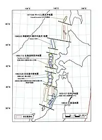 Seismicity along the eastern margin of the Sea of Japan extends from the west coast of Honshu and Hokkaido to Sakhalin in the north. The margin produced several large earthquakes during the 20th century—the 1940 earthquake ruptured a segment north of the 1993 event. A focal mechanism solution obtained for the 1940 shock corresponded to pure dip-slip (reverse) faulting on a near north–south striking plane. Seismologists have interpreted various rupture sizes for the earthquake in studies duing the 1960s and 1980s.[2] By using tsunami data, the source areas were 170 km (110 mi) × 70 km (43 mi) striking north-northwest–south-southeast,[7] and 100 km (62 mi) × 35 km (22 mi).[8] These reverse fault planes run parallel to the eastern margin of the Sea of Japan and are steeply-dipping.[9]