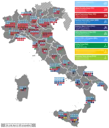 - ↑ The number of seats for each constituency ranged from 1 for Aosta Valley to 36 for Milan.