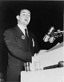 On July 14, Northern Democrats led by Minneapolis Mayor Hubert Humphrey and Illinois Senate candidate Paul Douglas pushed for the convention to adopt a strong civil rights platform plank and endorse President Truman's pro-civil rights actions.[4] They were opposed by conservatives opposed to racial integration and by moderates who feared alienating Southern voters (regarded as essential to a Democratic victory), including some of Truman's own aides. They were supported by northeastern urban Democratic leaders, who thought the plank would appeal to the growing black vote in their cities, traditionally Republican.[5]