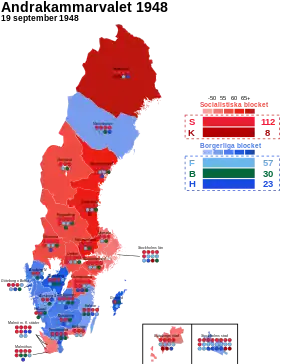 General elections were held in Sweden on 19 September 1948.[1] Despite a campaign by a large part of the Swedish press against socializing insurances, controlled foreign trade and rationing regulations still in use since the war, freshman Prime Minister and Social Democratic leader Tage Erlander managed to defeat the People's Party-led opposition under Bertil Ohlin by a higher election turnout. He maintained his government with only minor losses and the Swedish Social Democratic Party remained the largest party, winning 112 of the 230 seats in the Andra kammaren of the Riksdag.[2] Erlander was to stay on as Prime Minister until 1969.