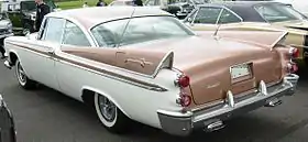 The Royal were the next step up. They used only the V8 engine. Identifying exterior characteristics include Royal script at the trailing edge of the belt-line molding, a pronounced "check-mark" at the rear up-sweep of the fin, chrome Dodge block letters on the front of the hood, chrome Dodge script on the passenger side of the trunk, and hood ornaments as standard equipment. Fin cap inserts were anodized with a horizontally ribbed pattern. Body styles offered were sedan, two-door hardtop (Lancer), and four-door hardtop (Lancer). Lancers were further identified by a lance and shield emblem on each fin.